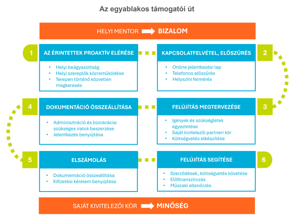 A Habitat for Humanity Magyarország Falusi LakHatás programja 2021 óta dolgozik azon, hogy ezeket a hozzáférést nehezítő akadályokat lebontsa, és a Falusi CSOK ingatlanfelújítási támogatását elérhetővé tegye. Az Erste Bank együttműködésével egy „egyablakos támogatói modellt” hoztunk létre, amely végigkíséri a háztartásokat a teljes folyamaton: a tájékoztatástól és jogosultsági ellenőrzéstől kezdve, a támogatási kérelem beadásán és a kivitelezés megszervezésén át egészen a felújítás befejezéséig, így segítve az állami támogatáshoz való hozzáférést az érintett háztartások számára. A program kezdetén azt feltételeztük, hogy a családok elsősorban az utófinanszírozás miatt szorulnak ki az állami támogatásból. A program előrehaladása során azonban a fent felsorolt akadályokat is azonosítottuk, illetve azt láttuk, hogy a felújítási munkákkal kapcsolatos nehézségek is sok családnak jelentenek kihívást. Az így szerzett tapasztalatokat a megvalósítás során folyamatosan beépítettük a támogatási modellünkbe.