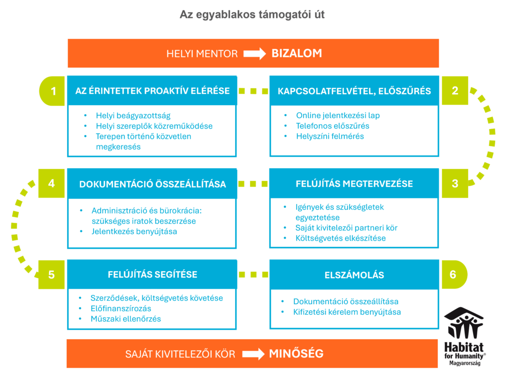 A Habitat for Humanity Magyarország Falusi LakHatás programja 2021 óta dolgozik azon, hogy ezeket a hozzáférést nehezítő akadályokat lebontsa, és a Falusi CSOK ingatlanfelújítási támogatását elérhetővé tegye. Az Erste Bank együttműködésével egy „egyablakos támogatói modellt” hoztunk létre, amely végigkíséri a háztartásokat a teljes folyamaton: a tájékoztatástól és jogosultsági ellenőrzéstől kezdve, a támogatási kérelem beadásán és a kivitelezés megszervezésén át egészen a felújítás befejezéséig, így segítve az állami támogatáshoz való hozzáférést az érintett háztartások számára. A program kezdetén azt feltételeztük, hogy a családok elsősorban az utófinanszírozás miatt szorulnak ki az állami támogatásból. A program előrehaladása során azonban a fent felsorolt akadályokat is azonosítottuk, illetve azt láttuk, hogy a felújítási munkákkal kapcsolatos nehézségek is sok családnak jelentenek kihívást. Az így szerzett tapasztalatokat a megvalósítás során folyamatosan beépítettük a támogatási modellünkbe.
